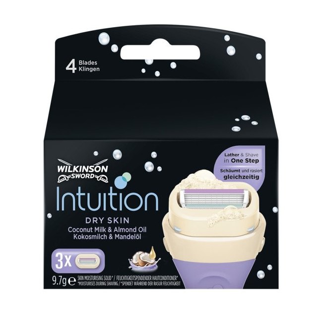 Čtyři břity, zvlhčující pásek a zásobník s pěnou holicí hlavice Wilkinson Intuition Dry Skin se postarají o lepší skluz strojku a hladší oholení bez použití dalšího gelu či pěny na holení.