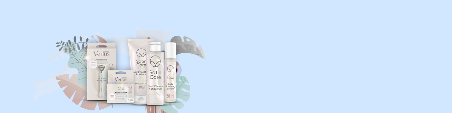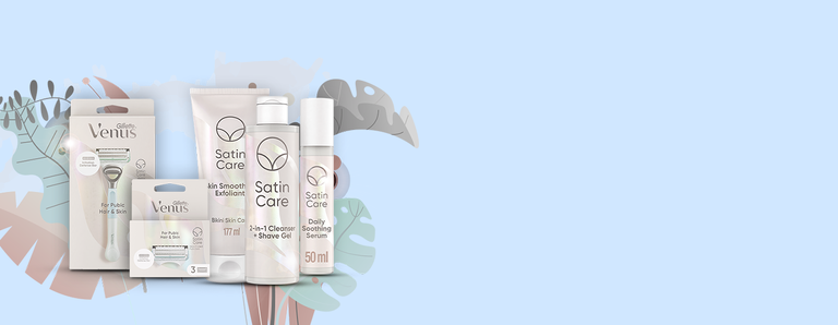 | Peeling pro vyhlazení pokožky | Mycí a holicí gel 2v1 | Venus holicí strojek na intimní partie | Zklidňující sérum na intimní partie | |